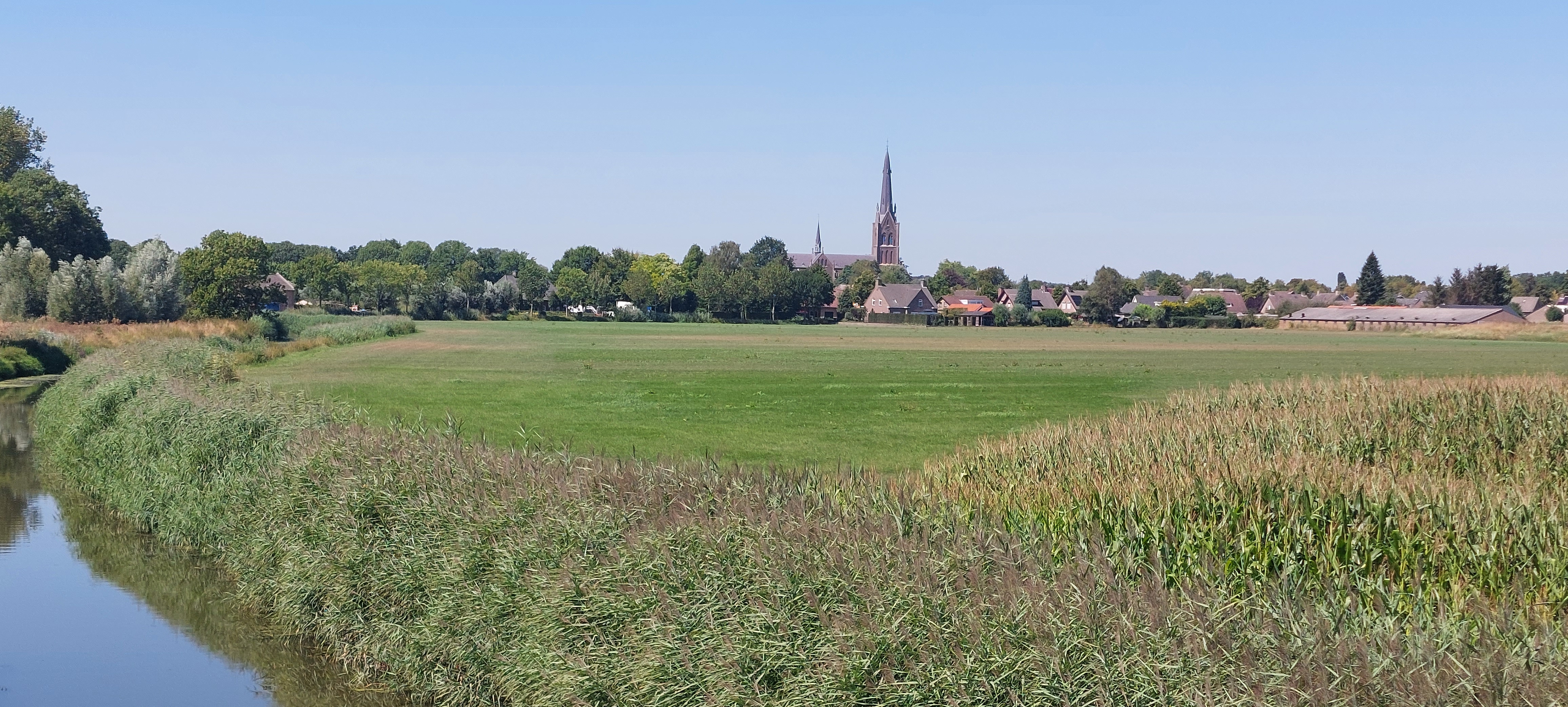 Veel door het boerenlandschap met toch ook we schaduw en volop in de zon (30 graden) langs kasteel Heeswijk, de kerk van Heeswijk en de kerk van Dinther (in de verte)