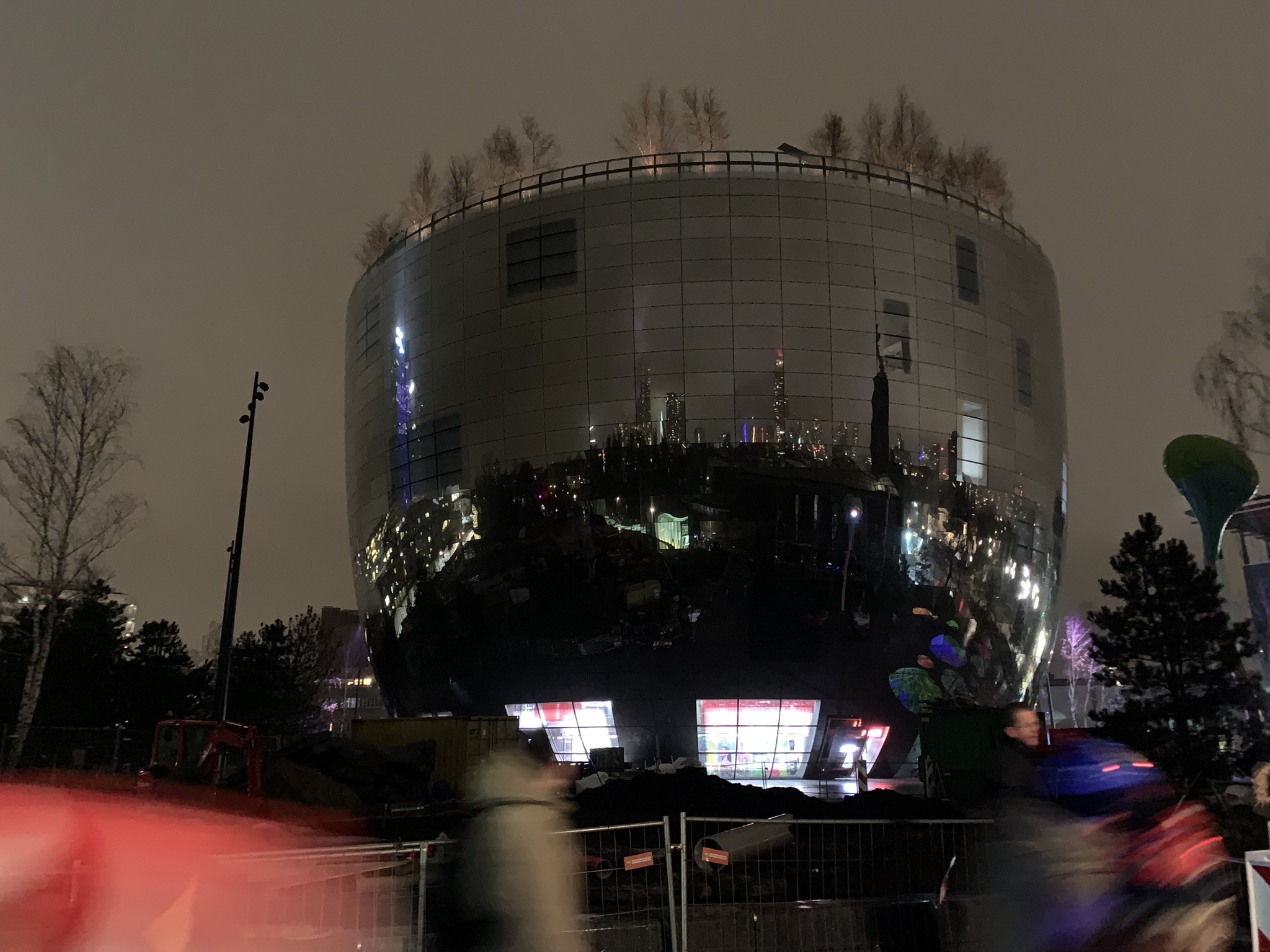 Vanuit het Erasmus naar Depot Boymans van Beuningen een prachtig gebouw een glimmende grote schaal.