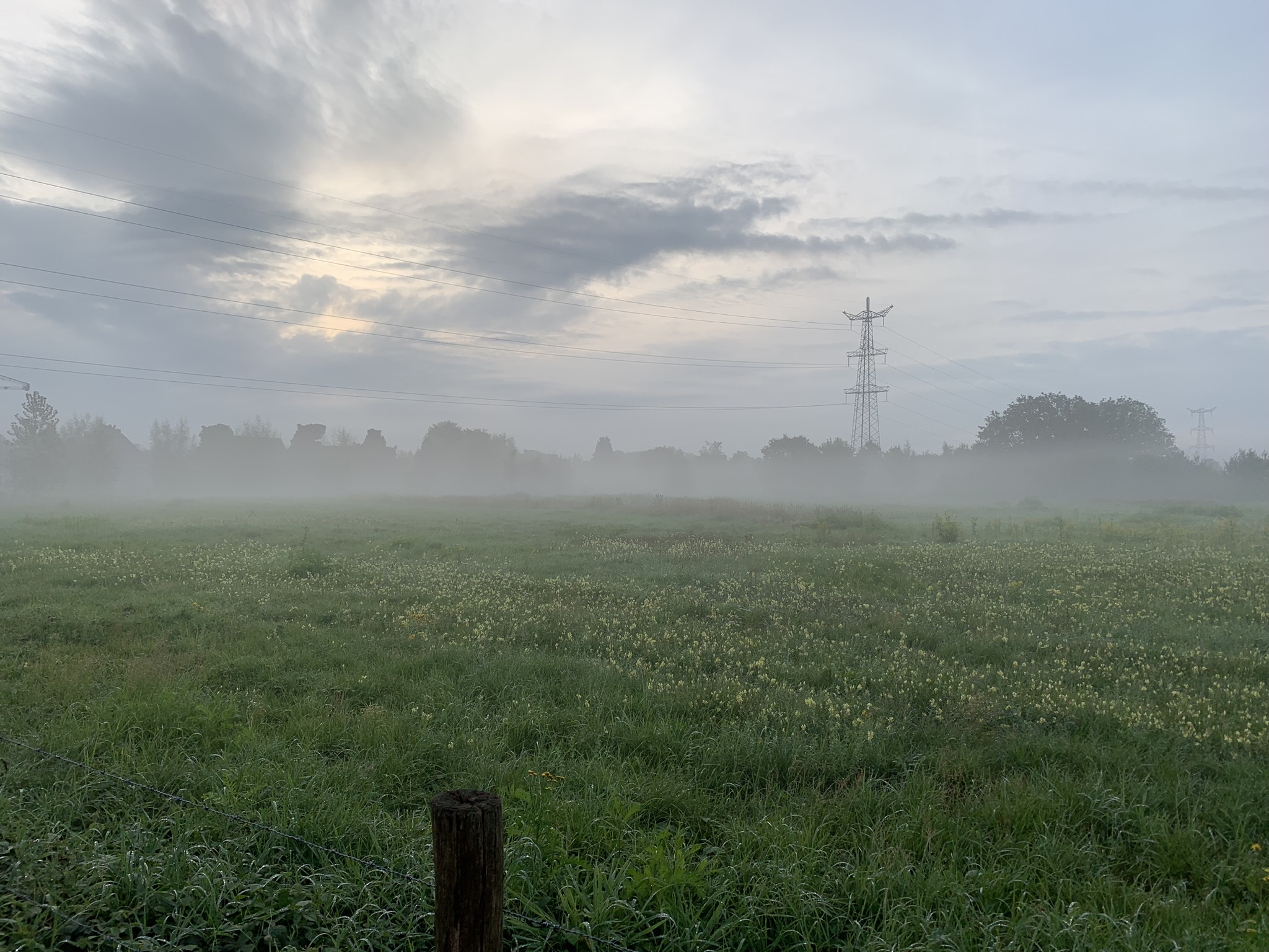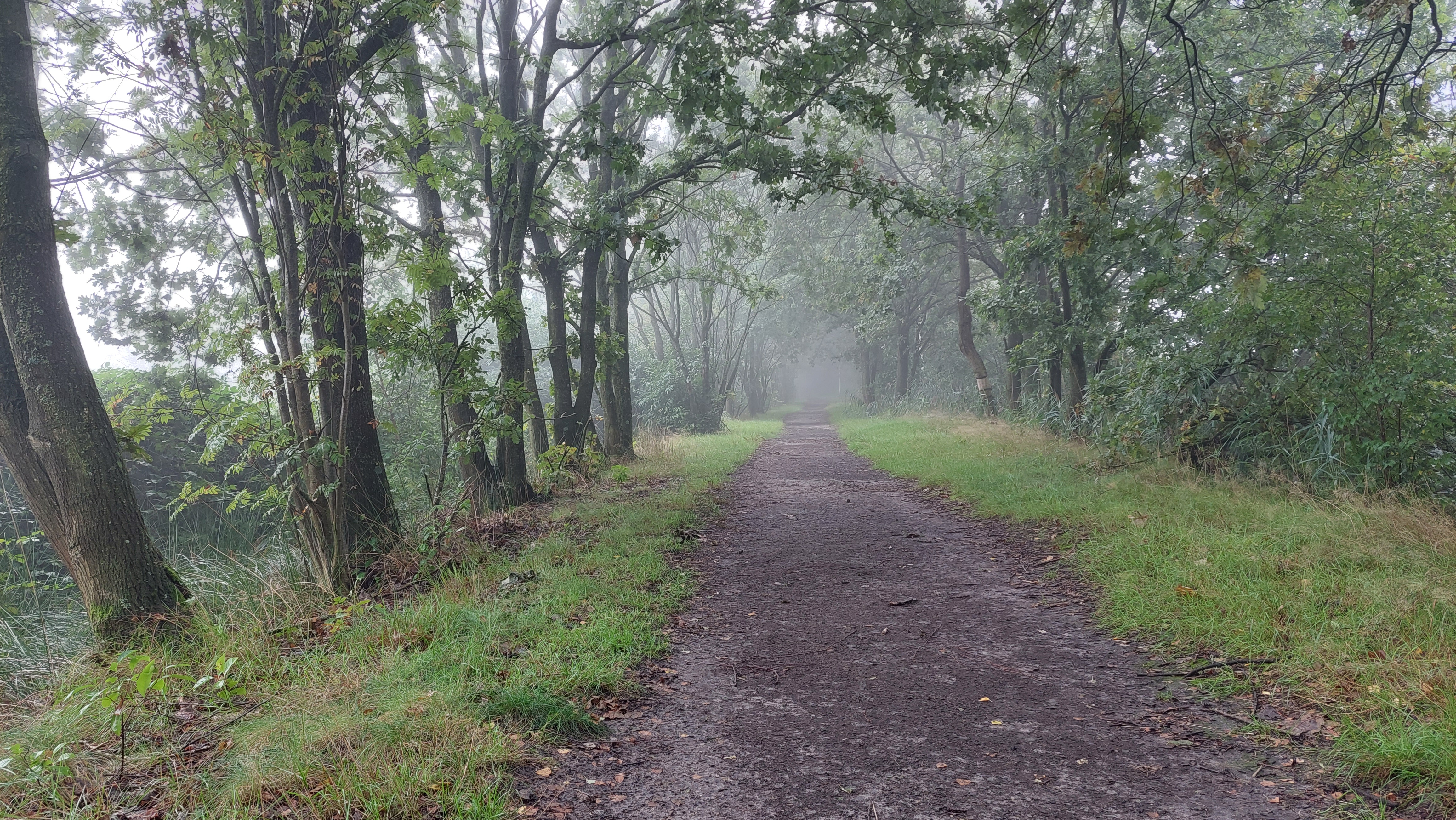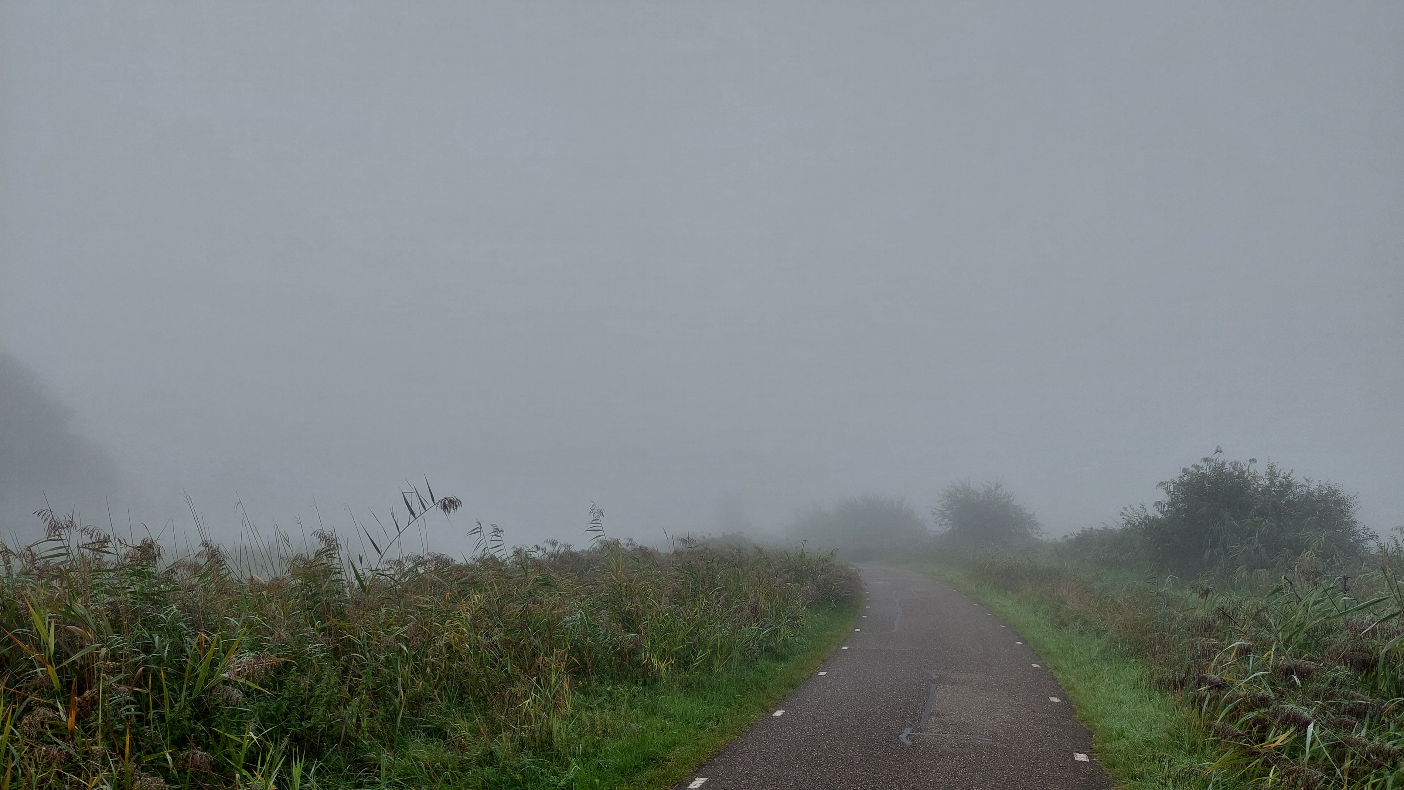 Gestart in de mist, heerlijk rustig en een zeer beperkte ervaring (zicht), de te volgen route borden rood met witte schelp.
