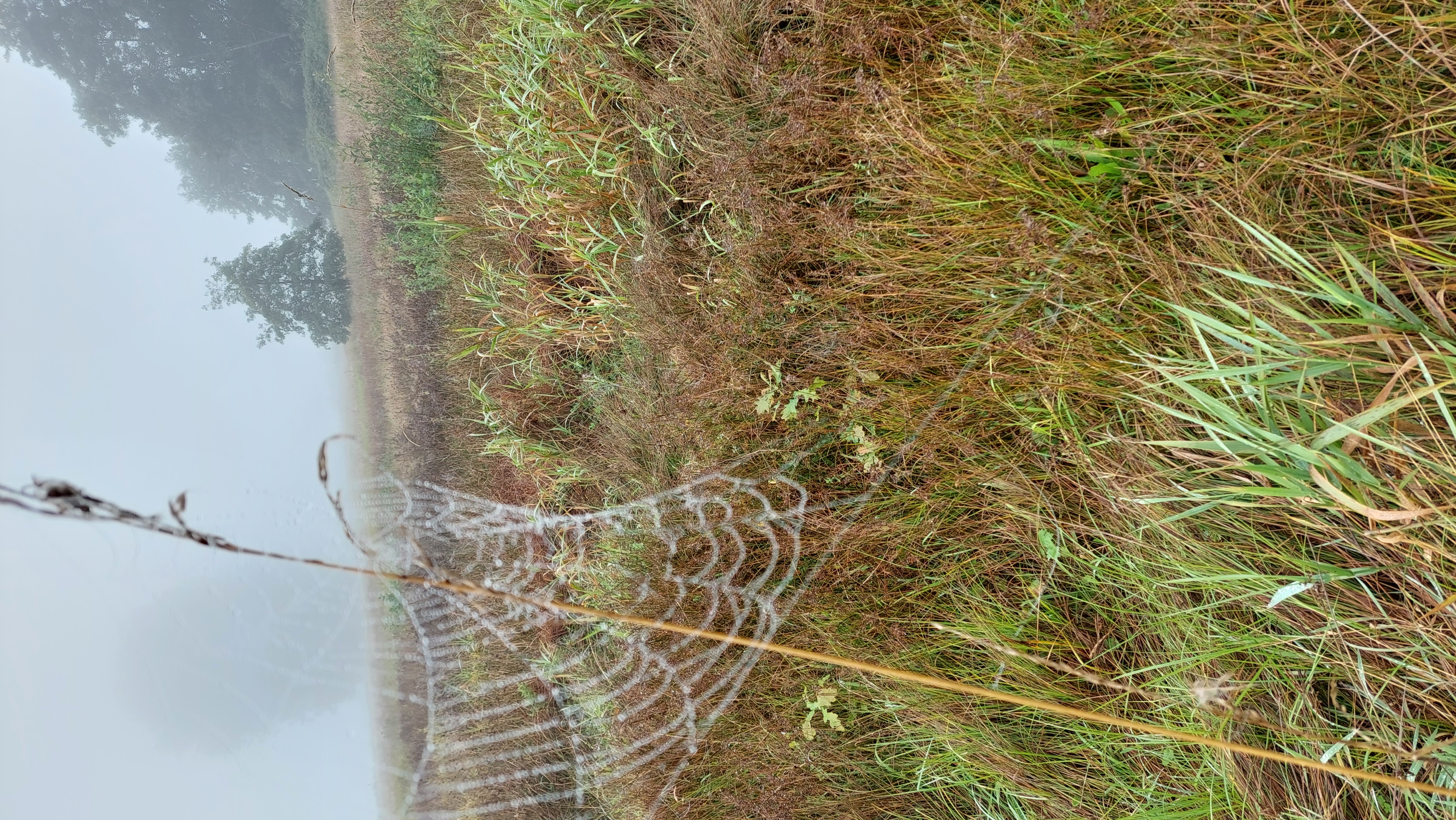 Diverse kunstwerken onderweg, ook de spinnen waren heel druk geweest die nacht, veel draden over de weg