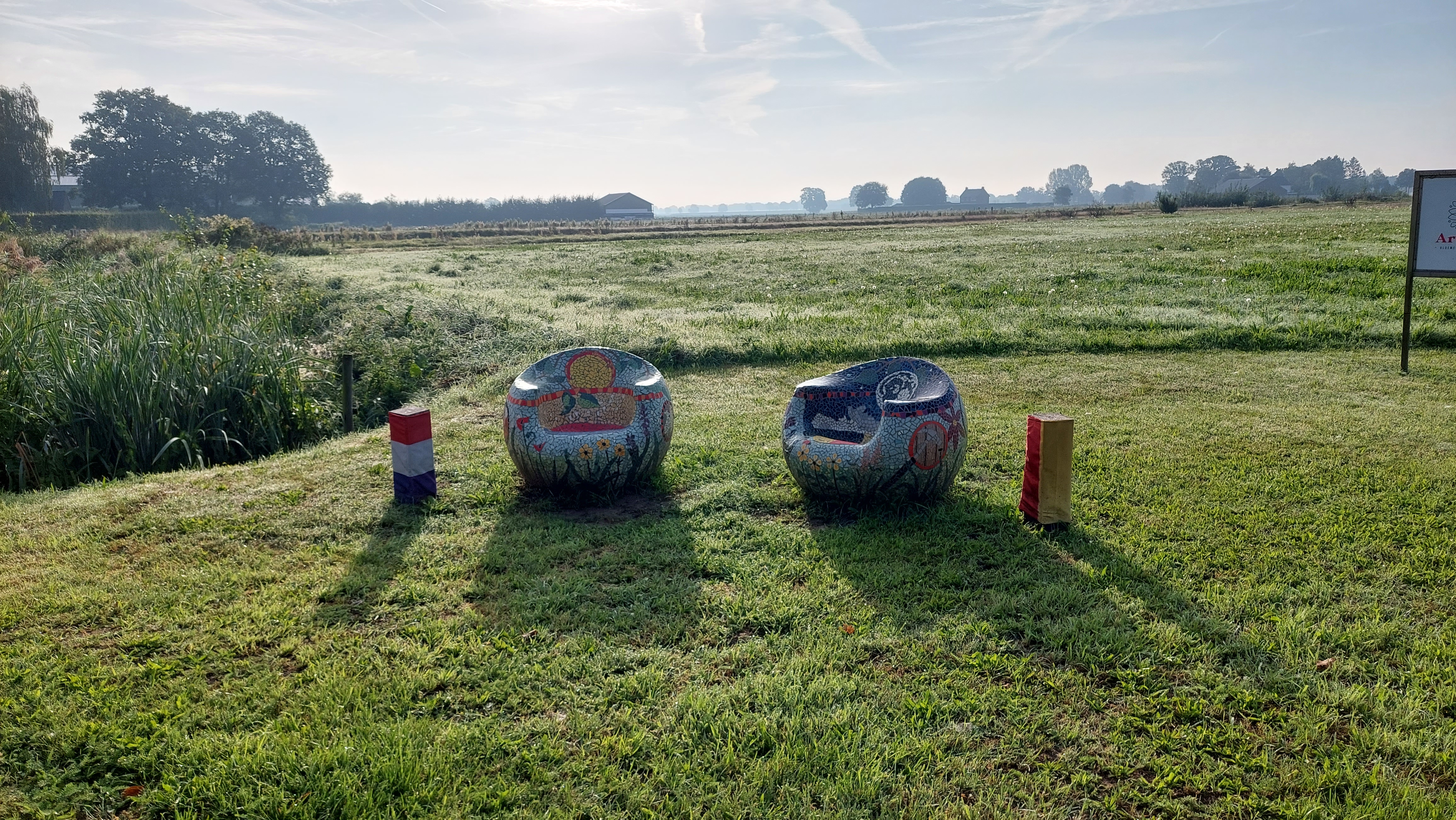 Ik kwam bij 2 stoelen die bestonden uit mozaiek. Toevallig kwam een bewoner met de hond langs en vertelde dat de stoelen door de buurt bewoners zijn gemaakt. De Mozaiek bevat alle beroepen en namen vanuit de buurt, timmerman, varkenshouder e.d.