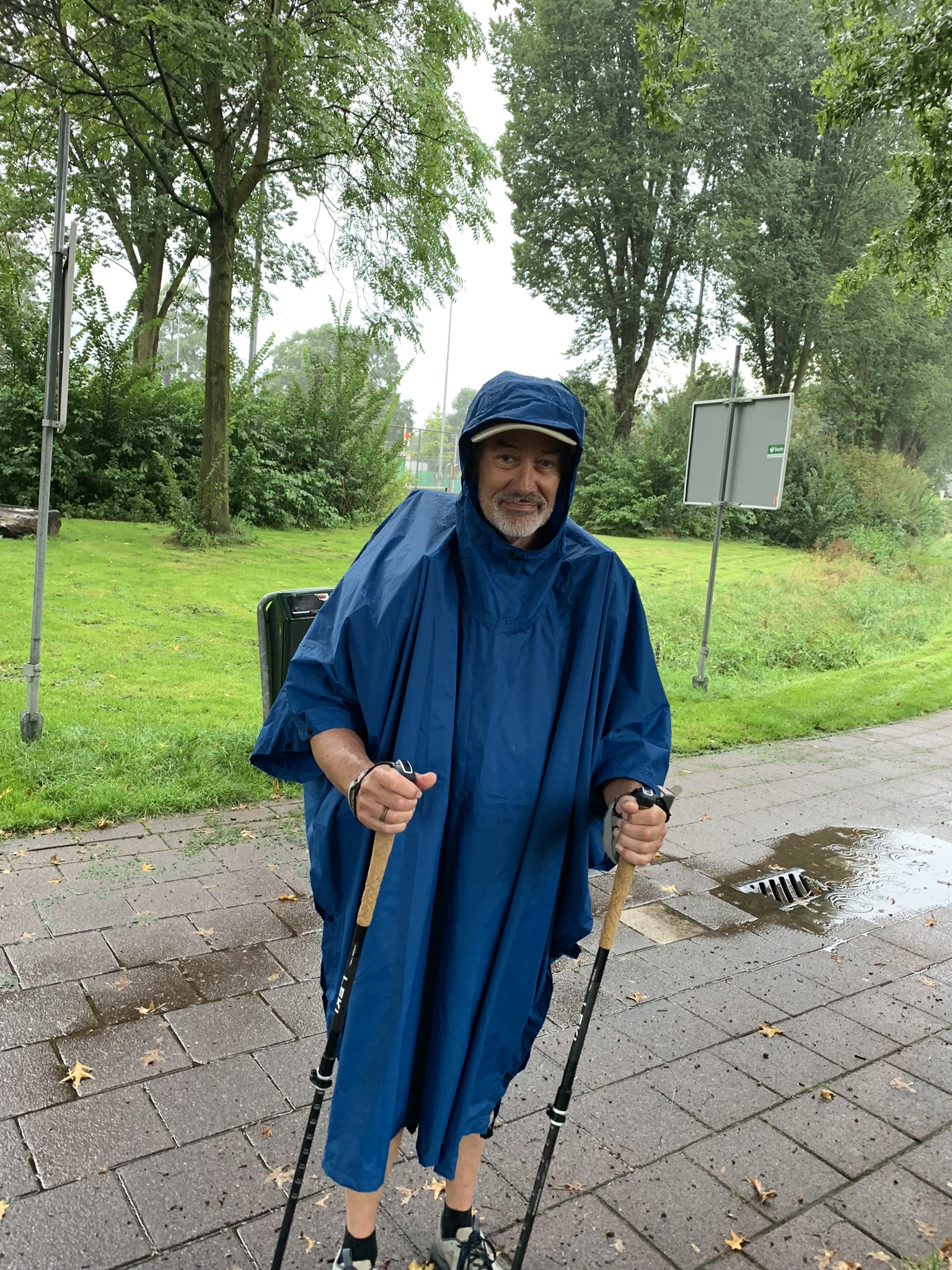Helemaal onbewolkt was het niet en na 1 uur kwam het onvermijdelijke. Een unieke kans om mijn regen poncho - tarp uit te proberen. Na wat gehannes (de poncho gaat ook over mijn rugzak) kwam een oude dame mij redden en trok de poncho over de rugzak want die bleef steken.