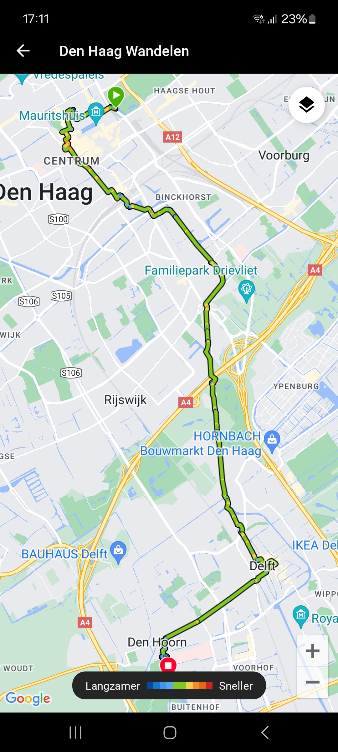 Vanuit de Binkhorst, langs de gillende kinderen bij Drievliet (leuk om te horen) langs Rijswijk richting Delft. Ik had geen idee dat het kanaal dat in de Binkhorst begint helemaal doorloopt tot in Delft.