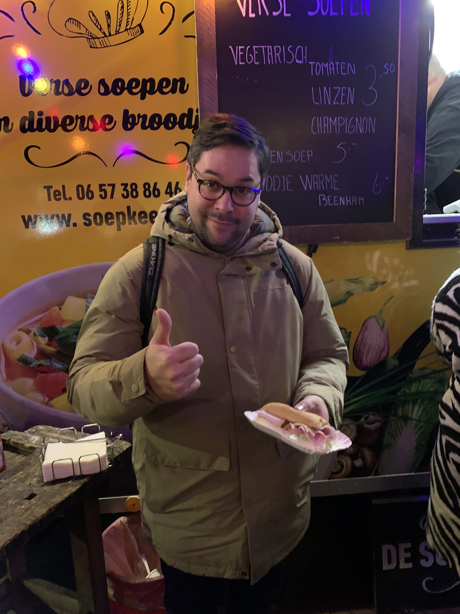 Op het terrein eerst het wandelpakket opgehaald handschoenen met lampjes, zie ook het filmpje, daarna soep, broodjes en koffie gehaald.
