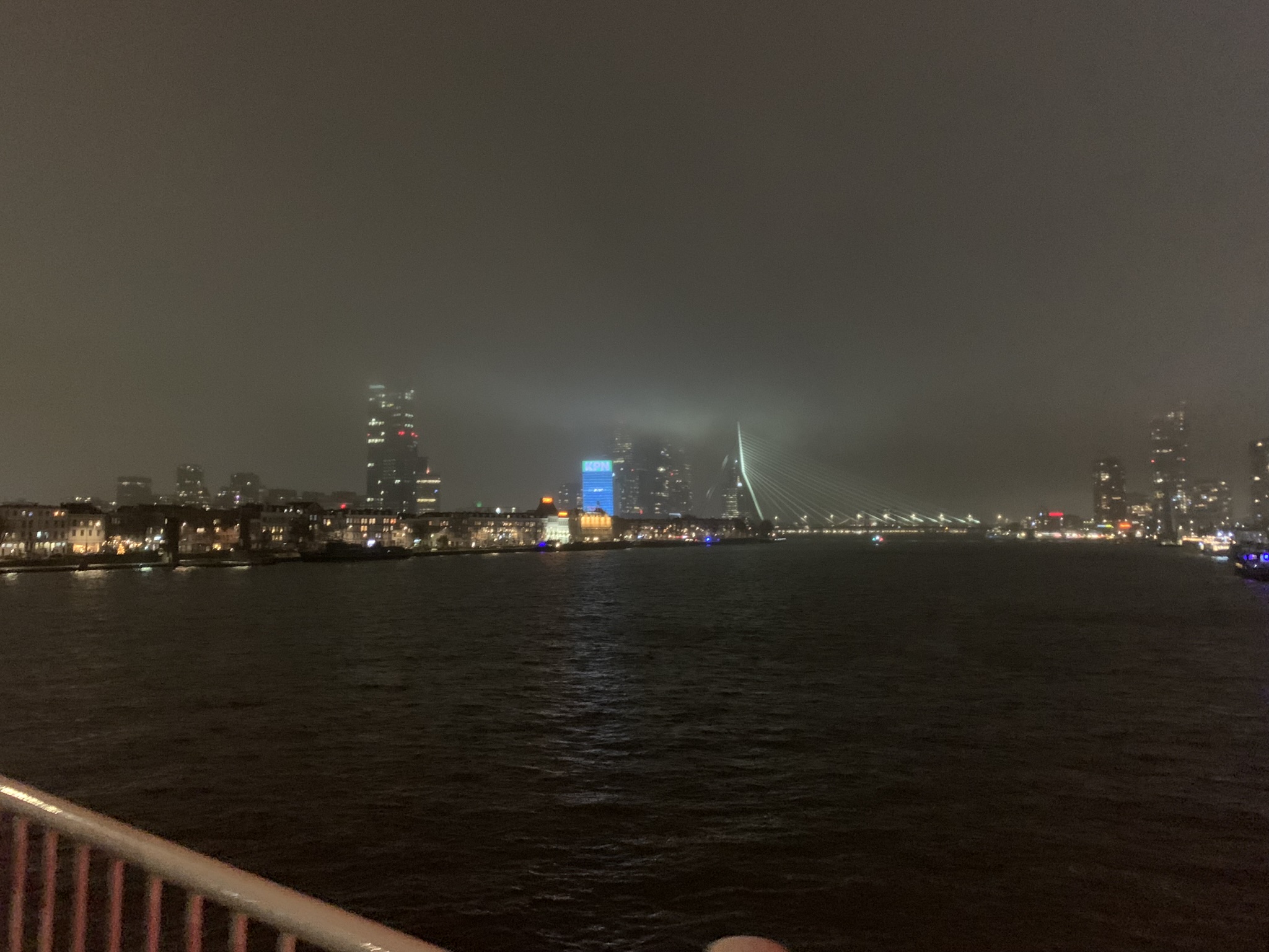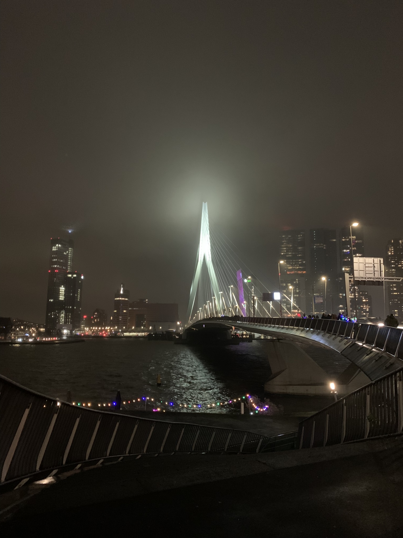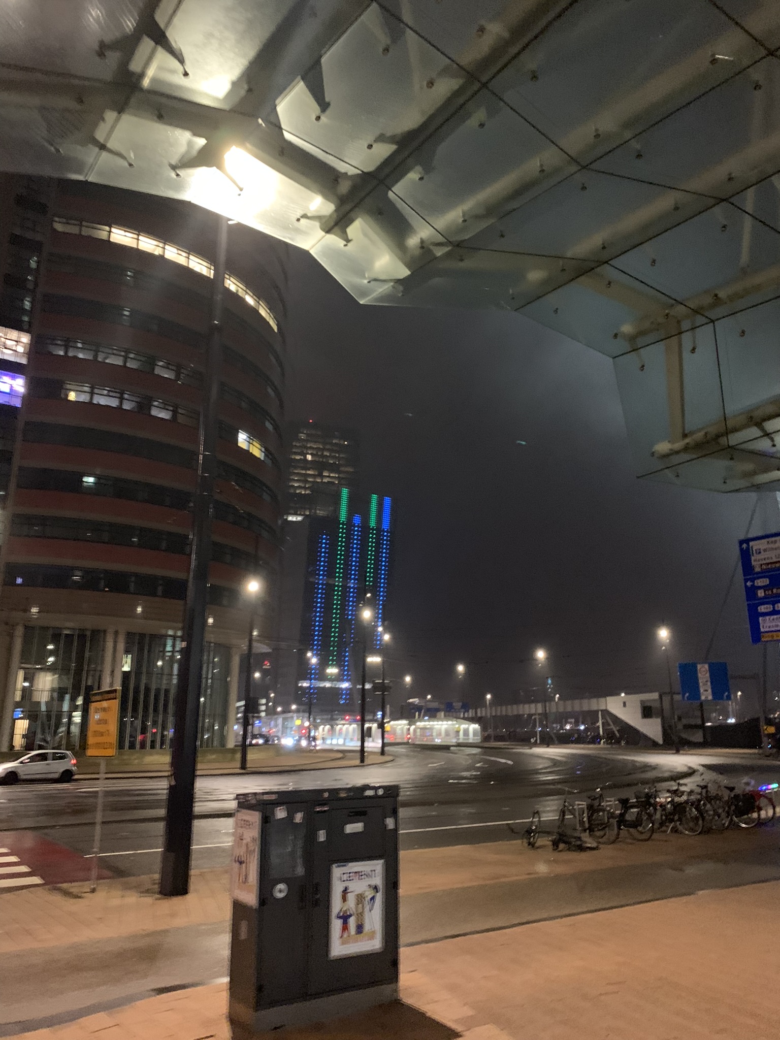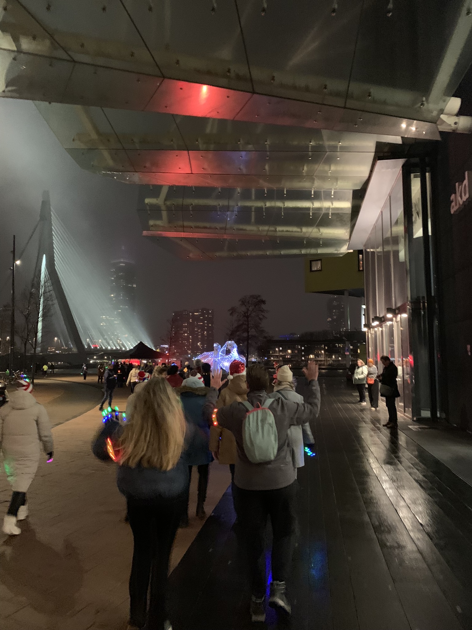 Veel verlichte gebouwen onderweg en via de Zwaan weer terug naar Erasmus.